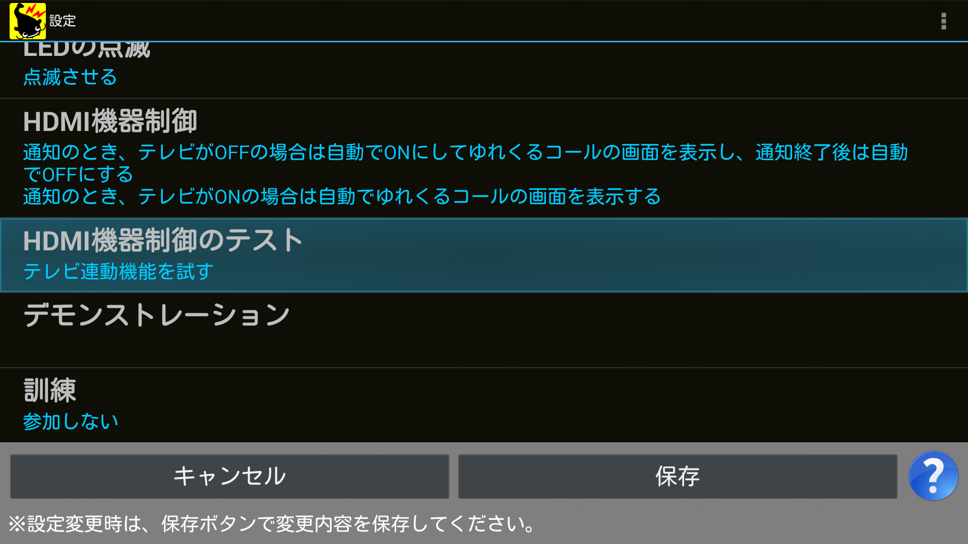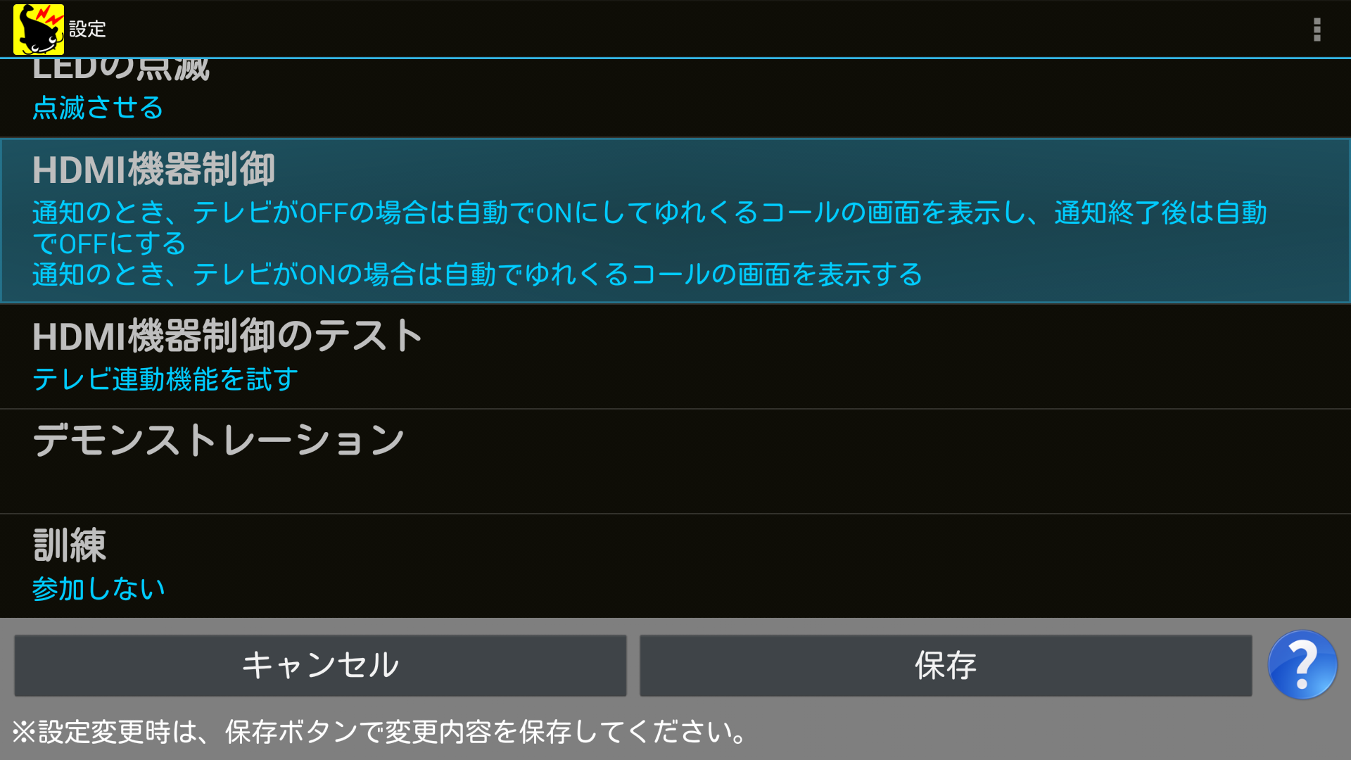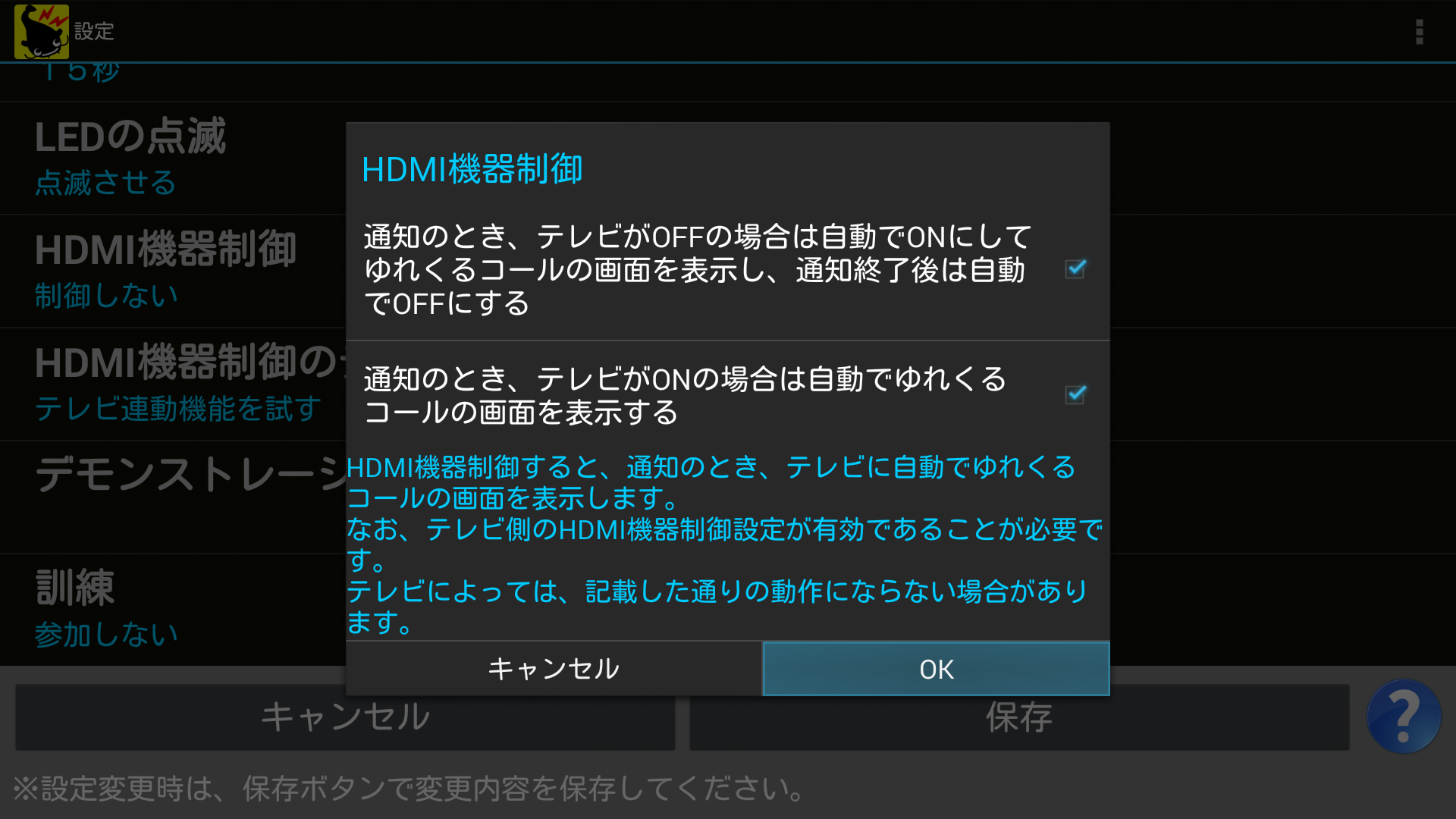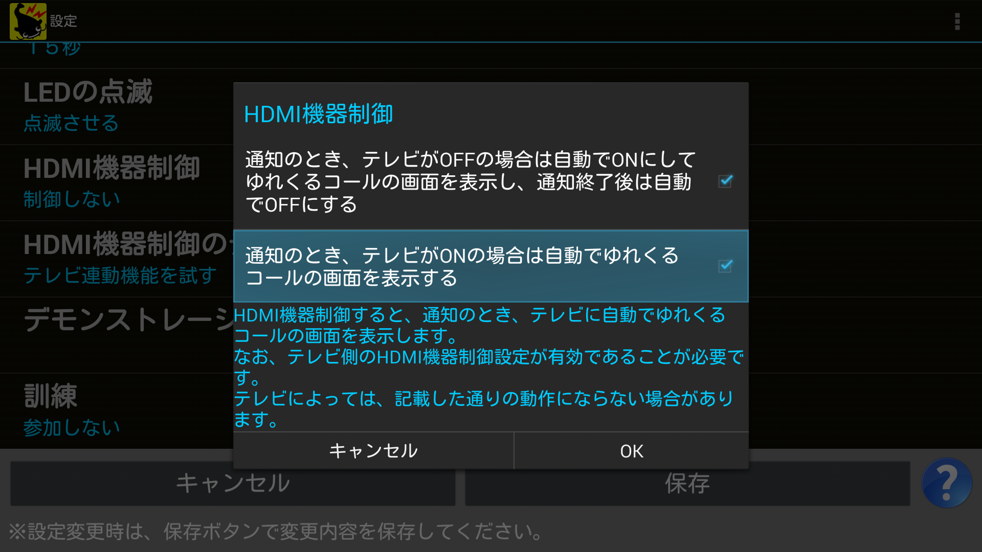 1つ目の項目では、テレビの電源がOFFのときに通知が来た場合に、自動的にテレビの電源をONにしてゆれくるコールの画面を表示させ、通知の終了後にテレビの電源をOFFに戻すという動作を設定できます。