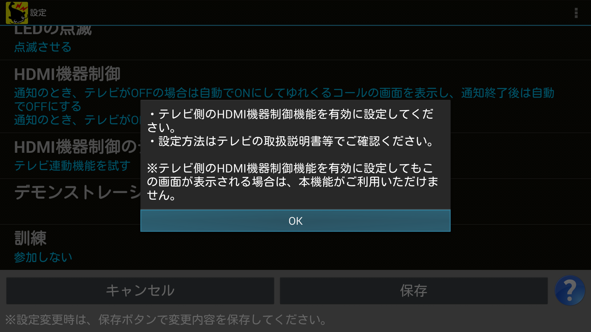 テレビのHDMI連携機能が使用できない場合は以下の画面が表示されます。