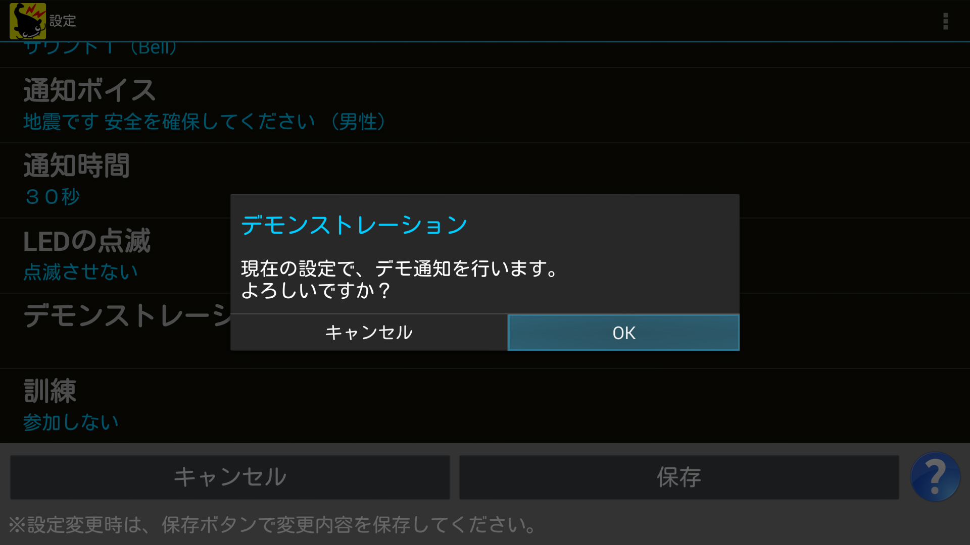 現在の設定で、通知されたときの画面表示や音の再生を、デモンストレーションすることができます。