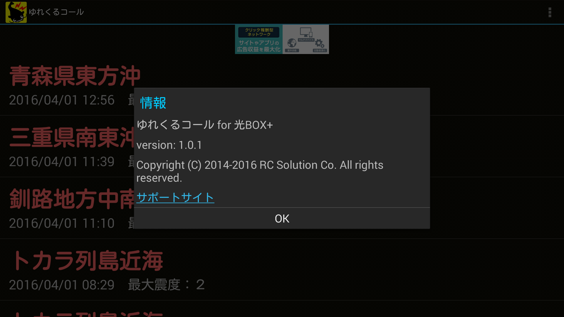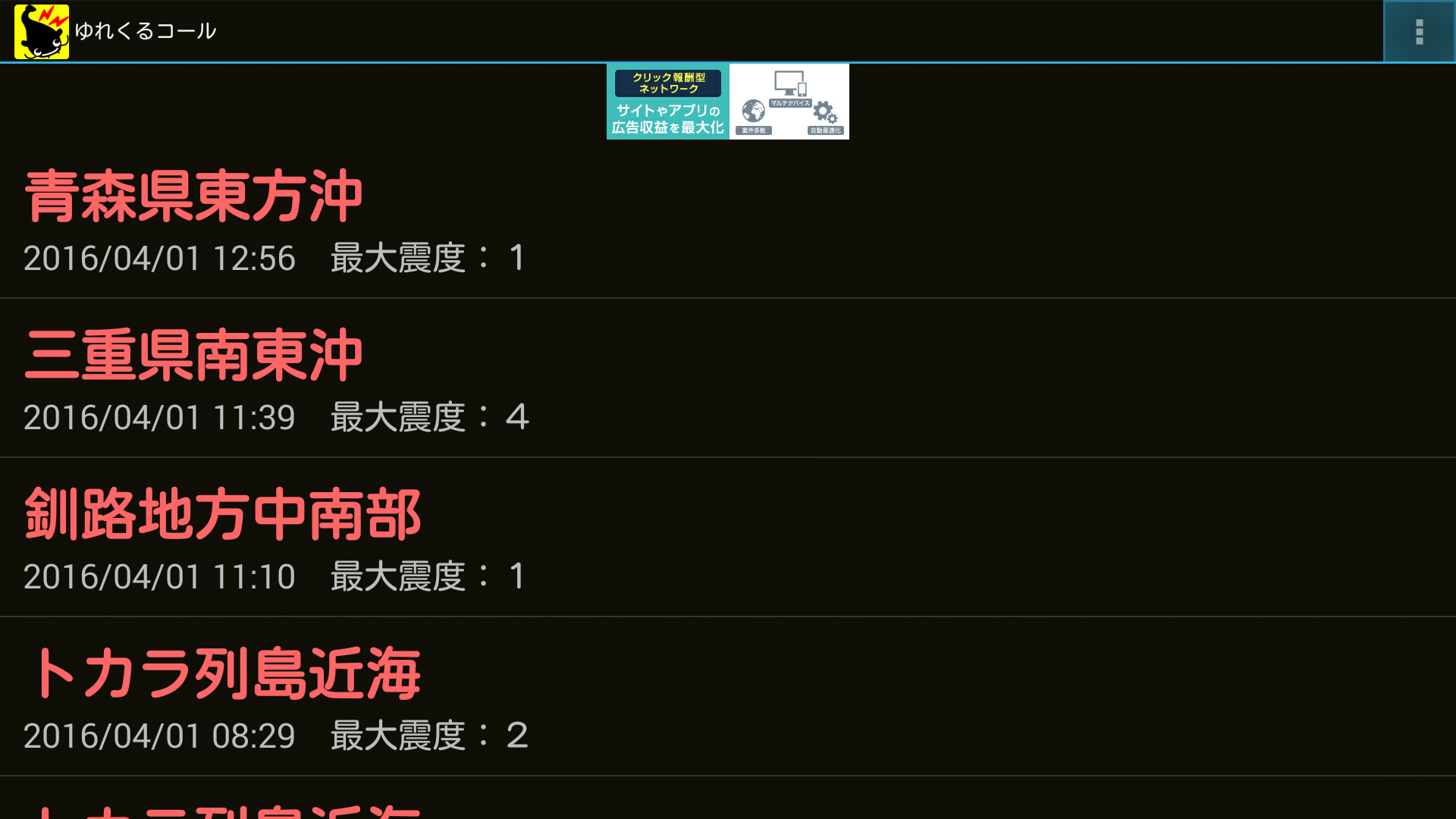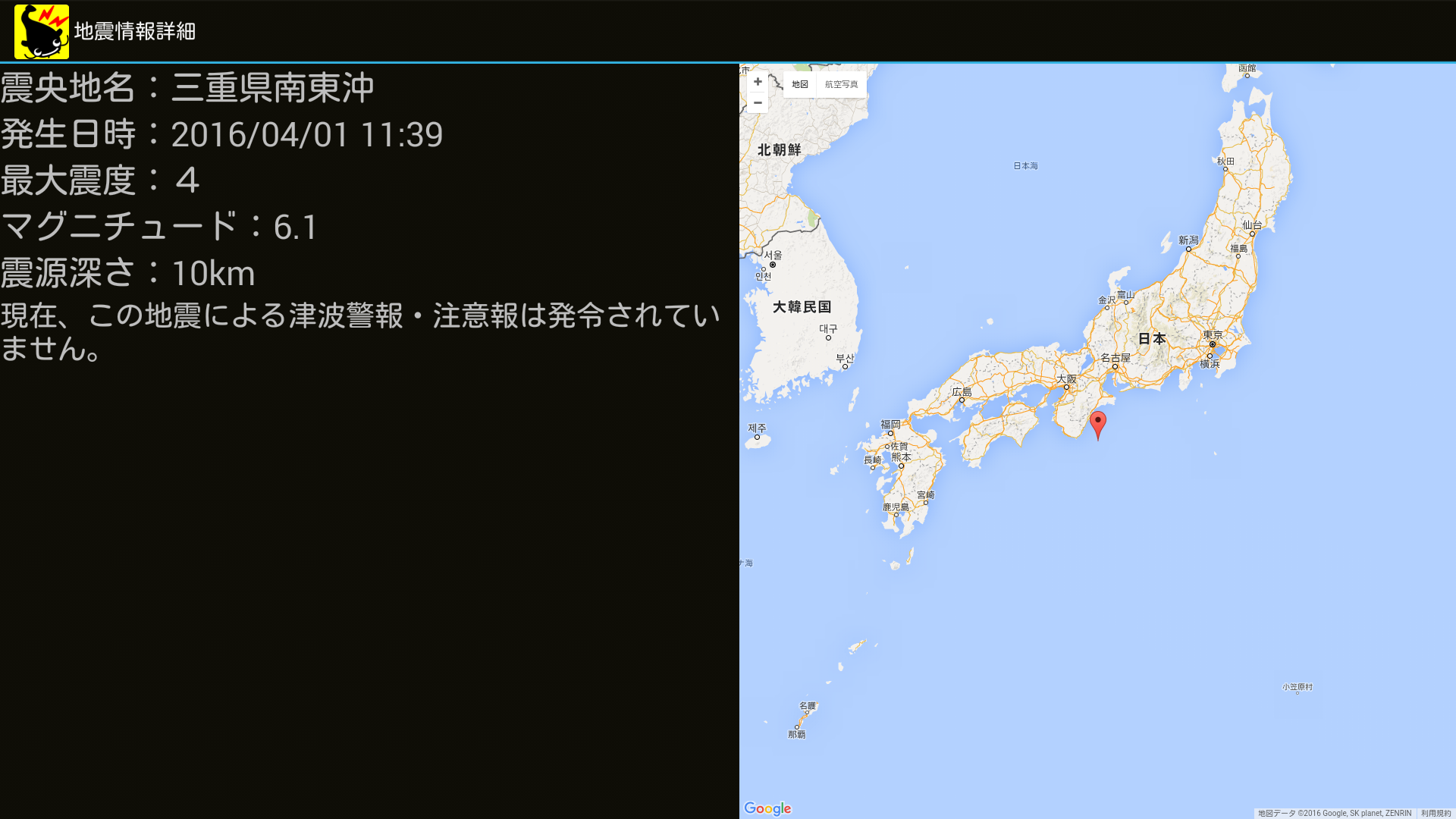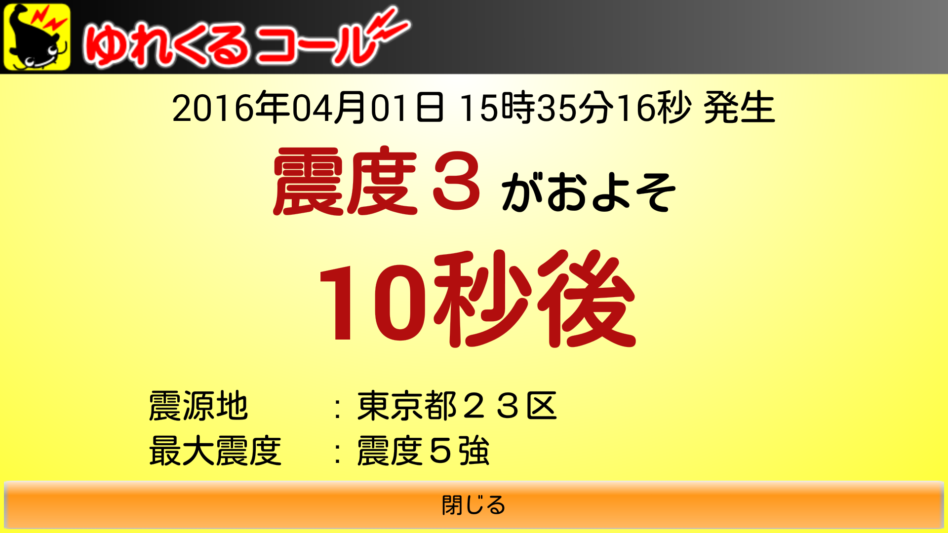 他に震源地や最大震度の情報も表示されます。