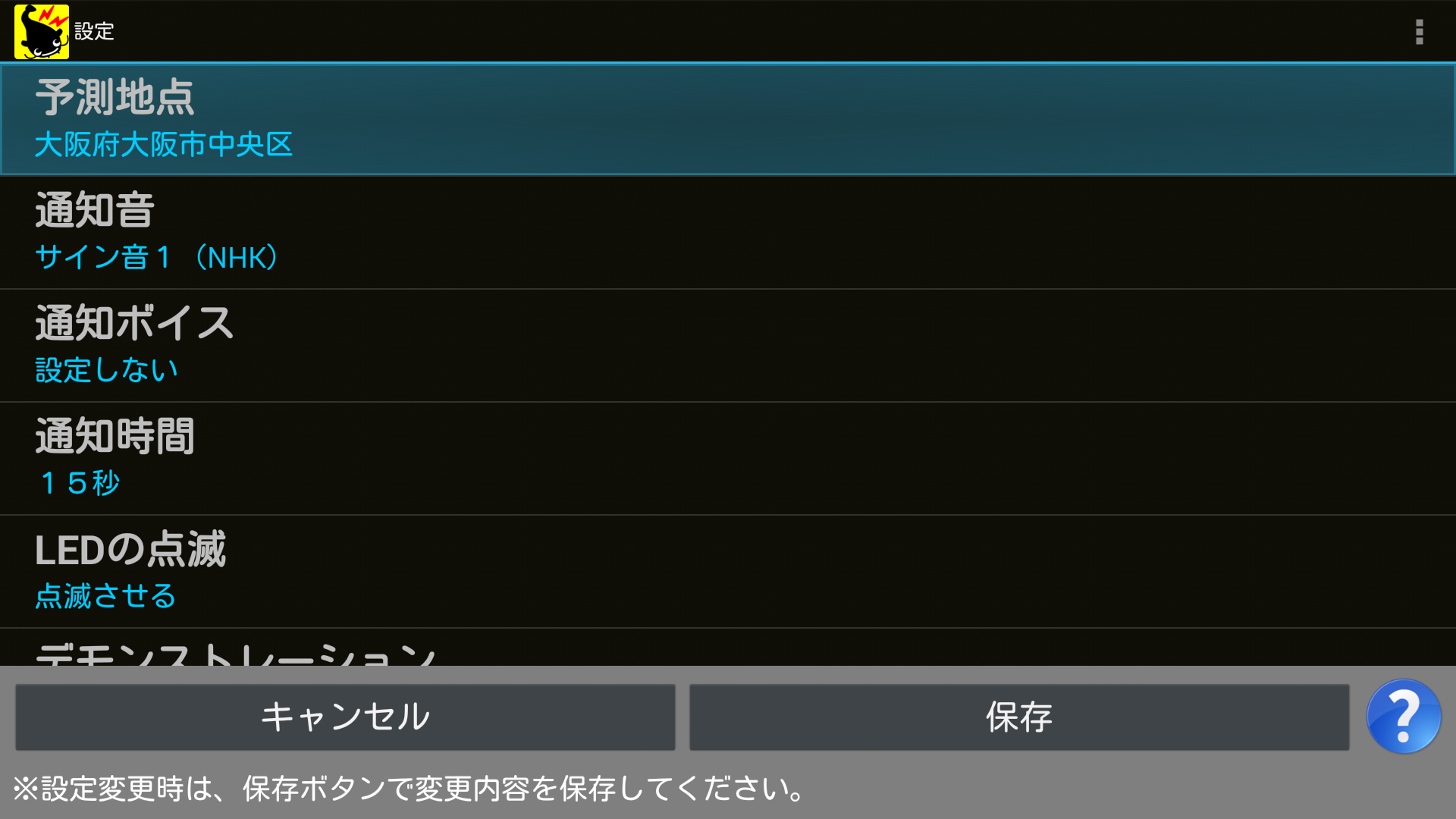 選択した震度以上の地震が予測地点で発生すると予測された場合、通知が届きます。