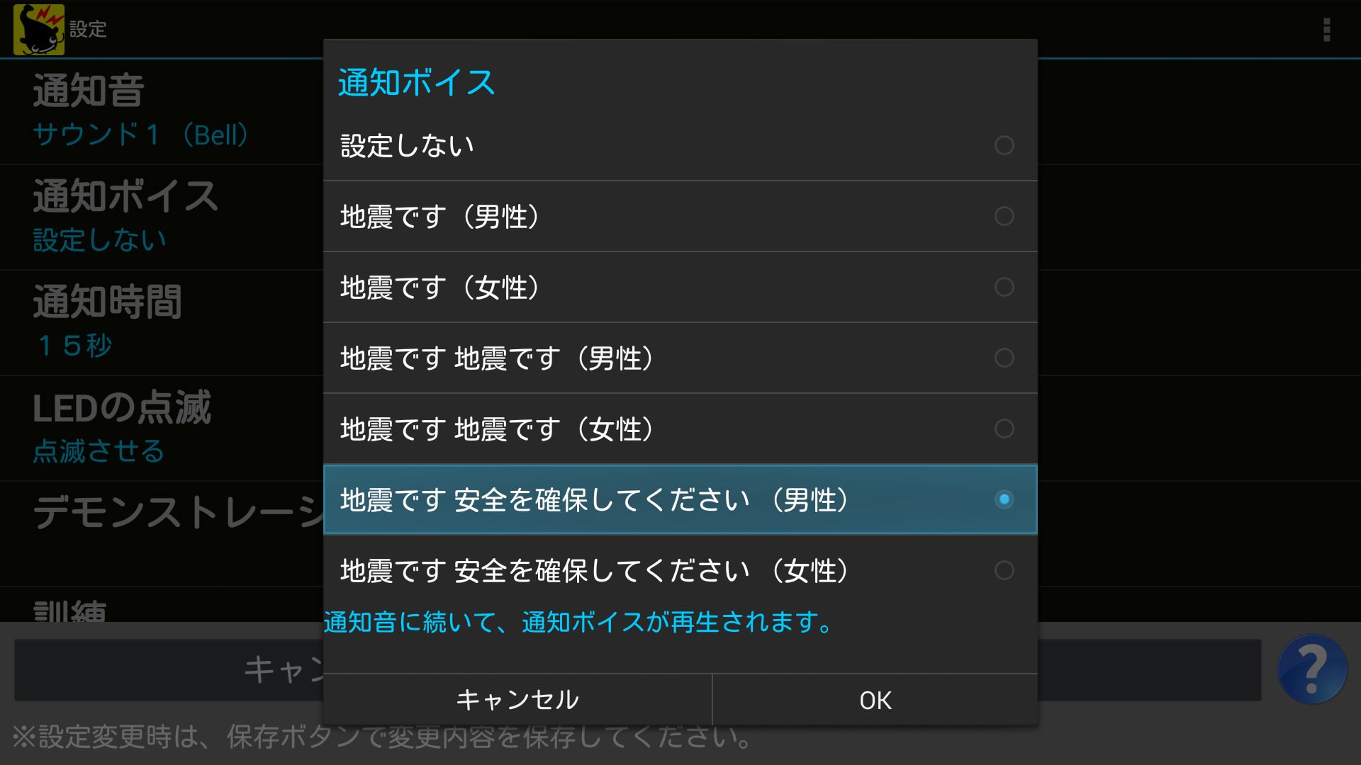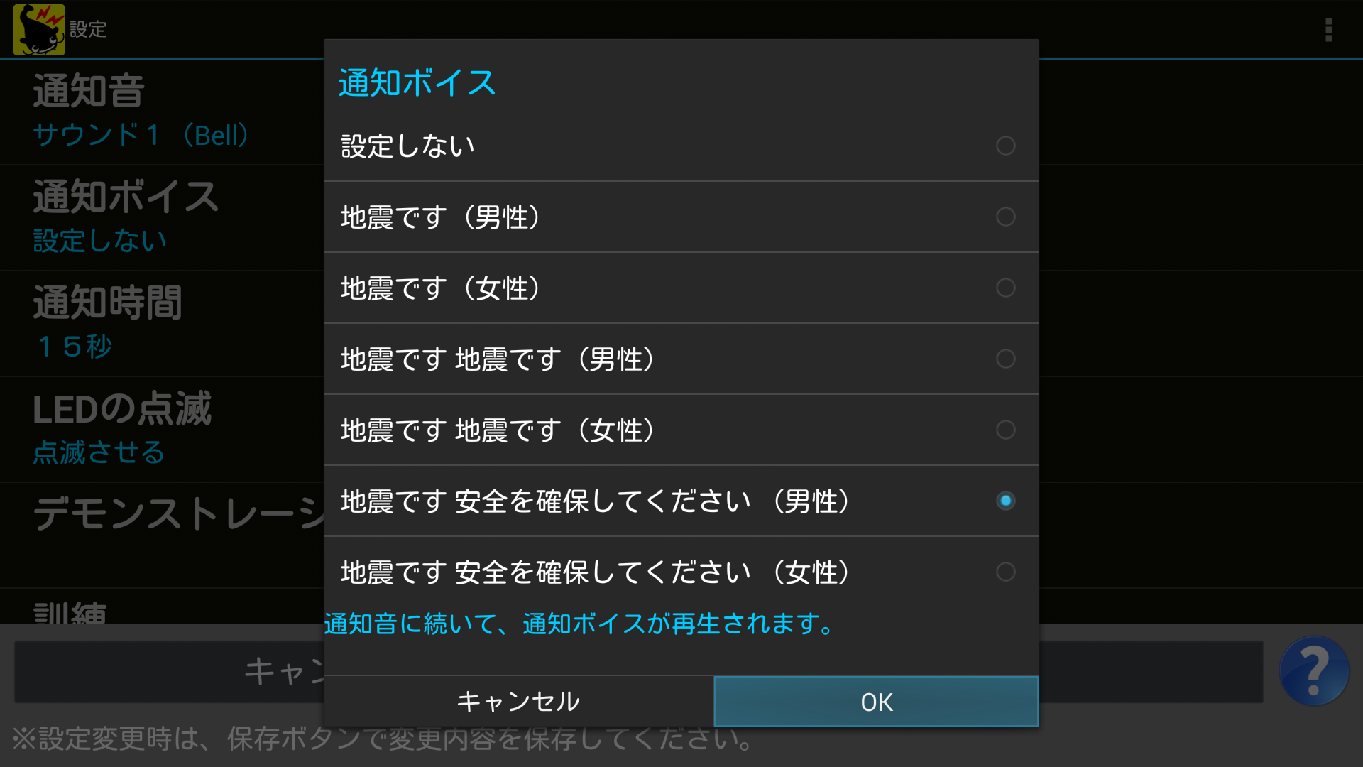 決定ボタンを押すと選択した通知ボイスが、一度再生されます。
